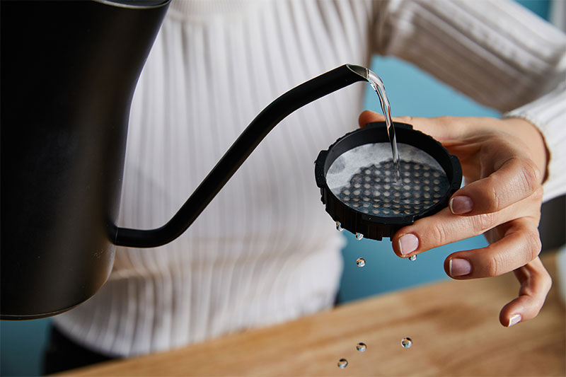 Next rinse the paper filter with hot water; otherwise, it will give off a papery taste. You can also quickly rinse the body of the AeroPress to help heat up the entire device.