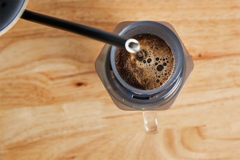 After 15 seconds, pour the remaining 180 grams of water into the AeroPress. You can give the grounds one more quick swirl and stir before attaching the plunger and waiting until the 1 minute mark. Keeping the plunger on the AeroPress prior to plunging will help the brewer retain its heat which helps extraction.