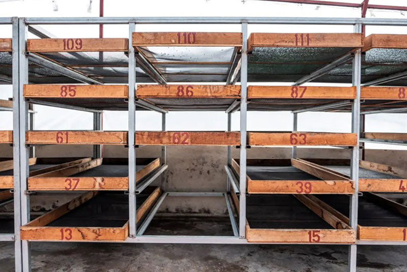 In honey processing, the outer skin of the coffee cherry is removed while the sweet mucilage layer is left on the bean as it dries. The term "red" describes the mucilage's hue as it dehydrates on the beans. This layer is eventually removed along with the parchment during the milling process, but by that time, the sugars from the mucilage have infused the bean, enhancing the complexity of the coffee's flavor. Aquiares' Red Honey coffee is dried on elevated beds over a period of 18–24 days.