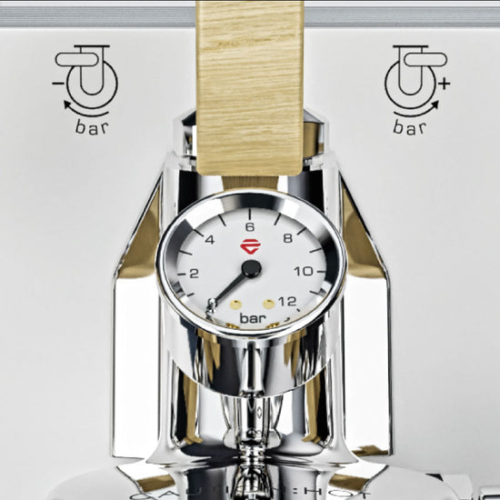 The double manometer allows for both steam boiler and water pressure monitoring during coffee extraction.
